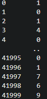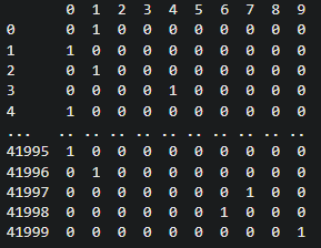 第一列是序号,0-9中显示为1的是标签,eg:第0行1处显示1,则说明该行标签为1;第0、41999行9处显示1,则说明该行标签为9