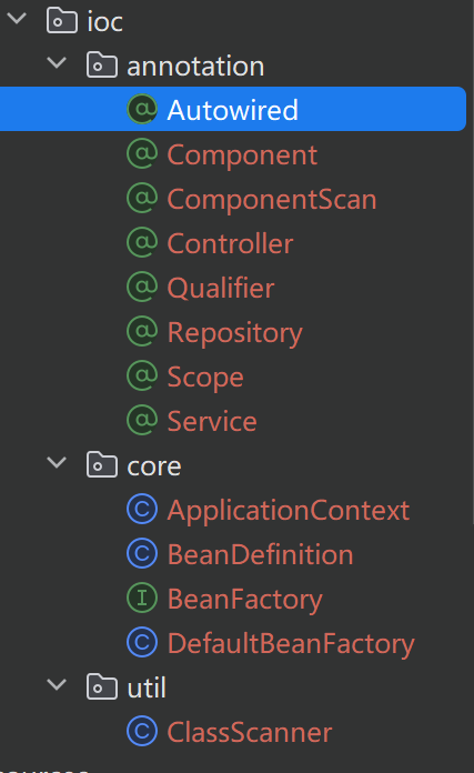 注解部分最基础的bean注解我们实现了Component,3层架构中的注解我们实现了Controller,Service,Repository,这3者均“继承”了Component(其实是在其注解定义中加入了注解@Component).